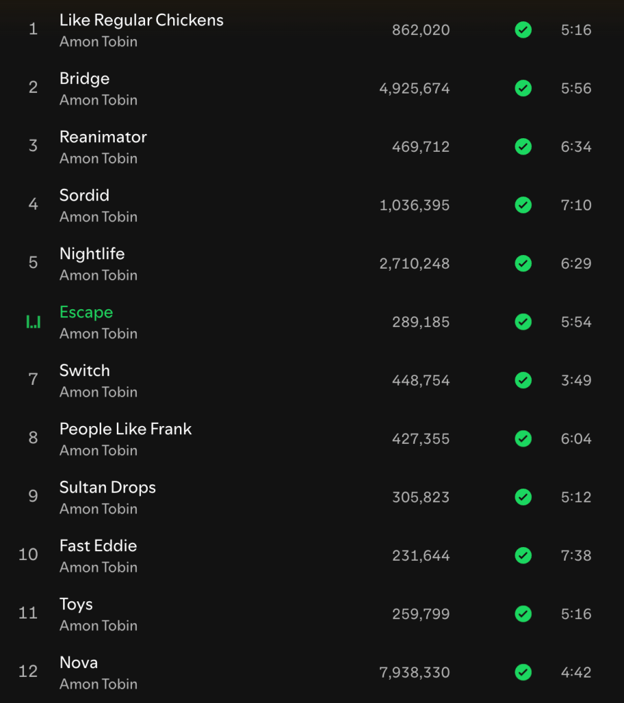 Consider one of the best albums I have listened to recently, Amon Tobin’s Permutation. Looking at the most streamed songs, you see songs like Sordid and Nightlife. Now compared to most music, Amon Tobin is rather far-out and experimental, but I’d consider songs like “Sordid” and “Nightlife” to be great songs, but not super avant-garde, at least compared to the others. “Escape” is one of the best songs, in my opinion, because of it’s use of unique samples and the way they are layered on top of each other. “Bridge” is also one of my favorites, and it has gotten a lot of streams. It isn’t too crazy, but it is so well made and makes great use of its 4/5 time signature.
